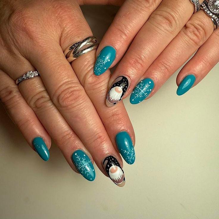 This design features a stunning teal base decorated with delicate white snowflakes and a charming gnome accent nail. The combination of cool tones and wintry motifs gives off a cozy, festive feeling that’s perfect for the Christmas holiday season.