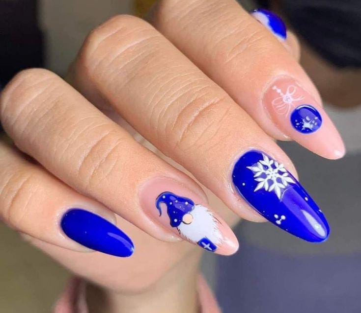 Deep royal blue nails bring a sense of frosty elegance, highlighted by crisp white snowflakes and an adorable gnome in a matching hat. The design feels magical and serene, like a snowy Christmas night under twinkling winter stars.