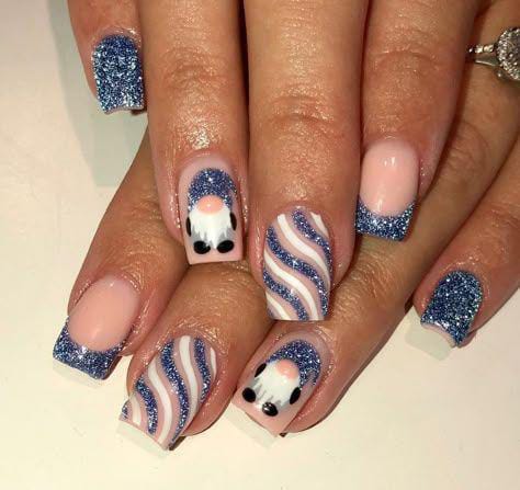 This look combines soft nude tones with shimmering blue waves and playful gnome faces, blending sparkle with a fun, frosty vibe. It’s a creative, festive twist that feels both stylish and cheerful for the Christmas winter season.