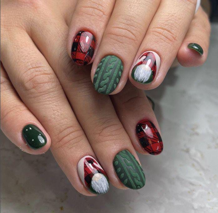 Earthy green and red plaid nails mix with textured knit patterns and a gnome motif, creating a rustic and homey Christmas look. It feels like a walk through a snowy forest wrapped in a cozy sweater.