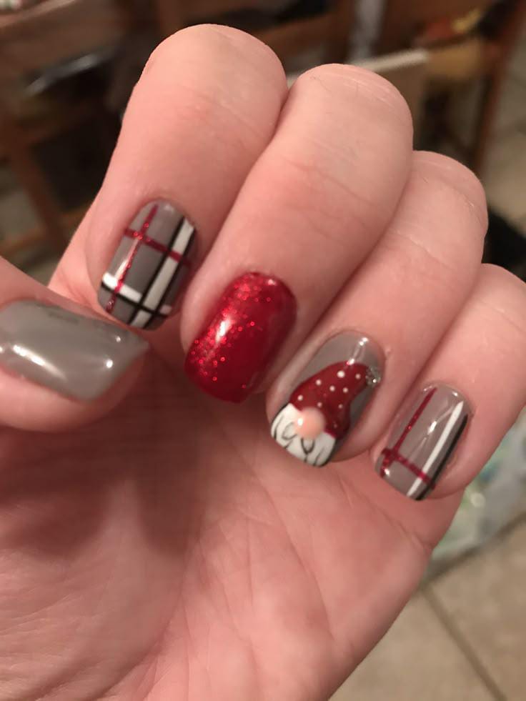 This design mixes bright red plaid patterns with a cute gnome accent nail, giving off a warm, festive vibe perfect for Christmas. The bold red and neutral tones make it both playful and cozy.