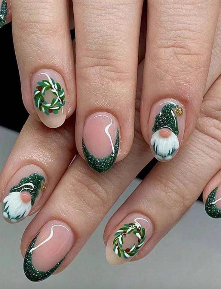 Elegant and festive, this design blends subtle nude tones with dark green French tips, tiny wreath details, and cute gnome art for a perfectly balanced Christmas look.