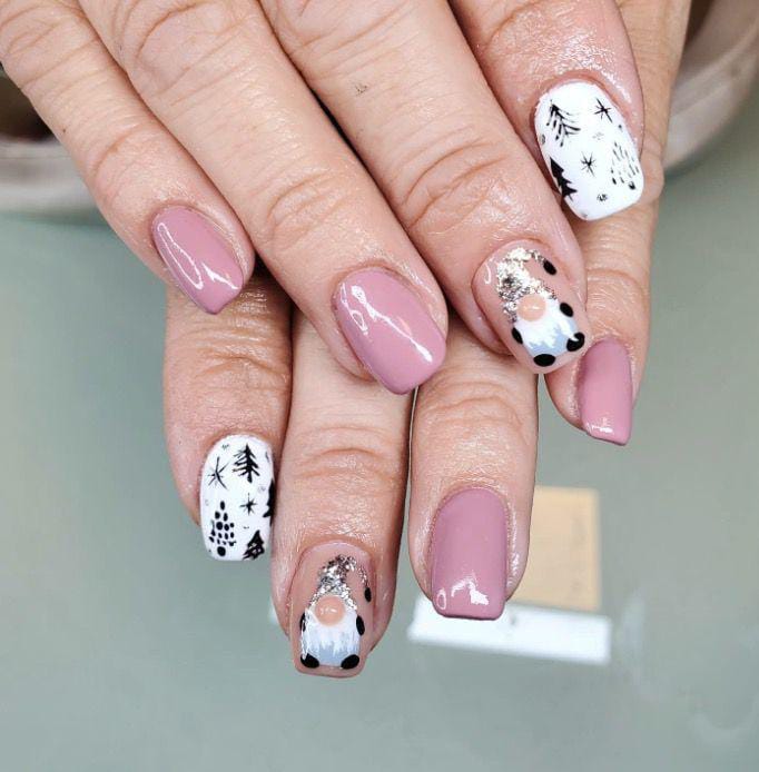 Soft pink and white nails paired with dainty gnome art and tiny black tree designs create a cute, modern twist on Christmas elegance.