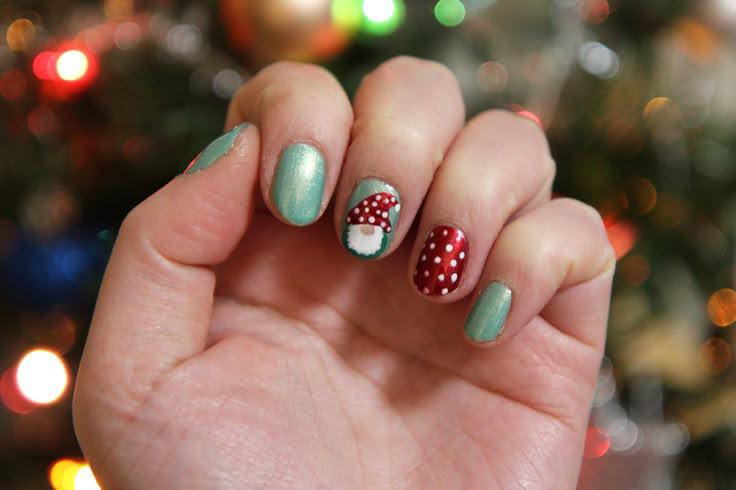 A mix of shimmering mint green and red polka-dot nails, featuring a tiny gnome design, captures a playful and cheerful Christmas charm.