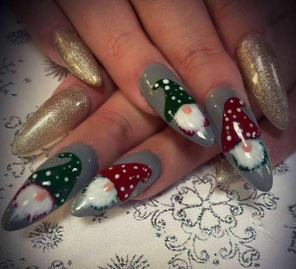 Featuring shimmering gold nails and playful gnome illustrations in red and green, this design adds a fun Christmas holiday twist with its cheerful, hand-painted charm.