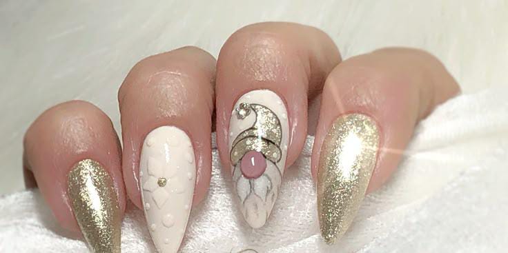 Elegant and modern, this look pairs glimmering gold nails with creamy white accents and delicate sweater-texture detailing, perfect for a classy Christmas winter statement.