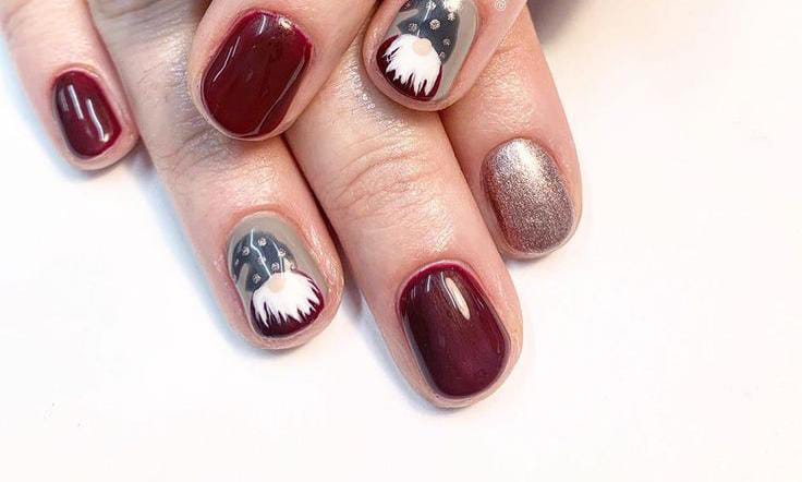 Rich burgundy tones meet soft gray and metallic shimmer, highlighted by cute gnome faces that bring warmth and whimsy to this Christmas festive manicure.