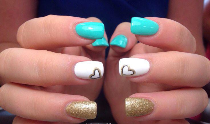 Fresh mint nails are paired with white and gold glitter accents and outlined heart details. The design feels light, trendy, and softly romantic Valentines.
