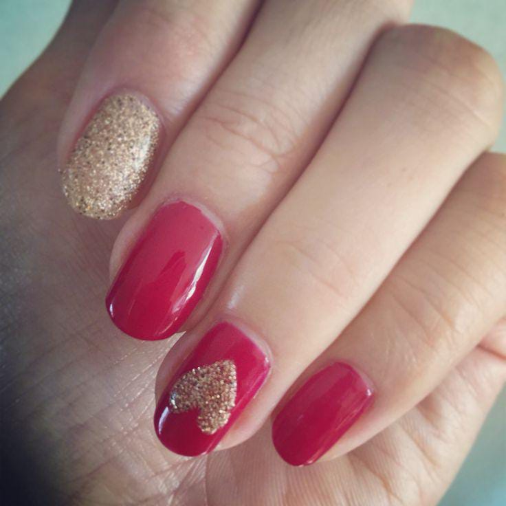 Bright red nails are paired with soft gold glitter accents for a bold yet romantic look. The gold heart detail adds a classy Valentine’s touch.