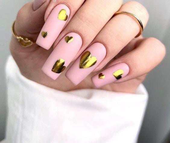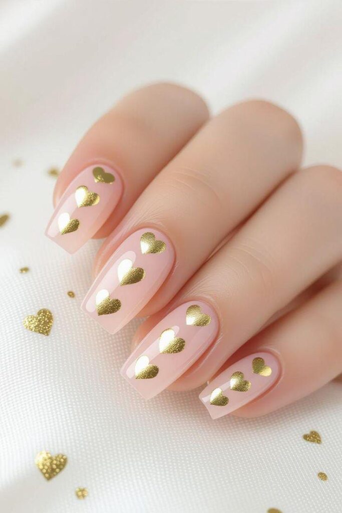 Blush pink nails are decorated with shiny metallic gold heart designs that stand out beautifully. The overall look is sweet, feminine, and chic Valentines.