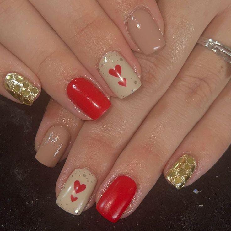 This design mixes red, nude, and gold tones for a warm and balanced Valentine look. Small heart details on a cream white accent, keep it playful yet polished.