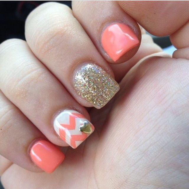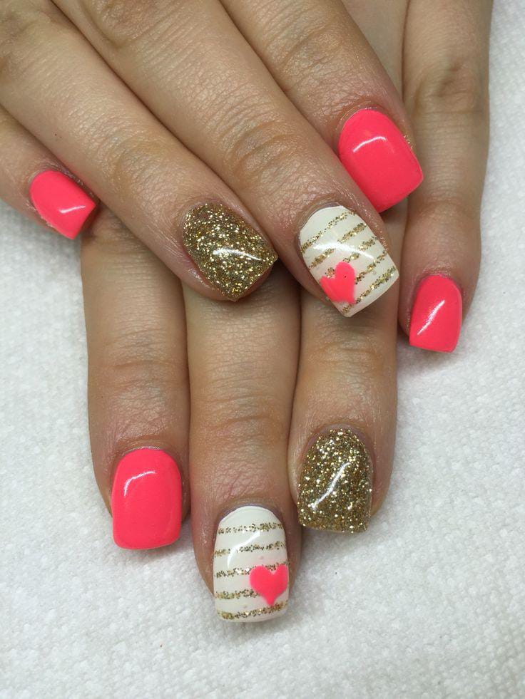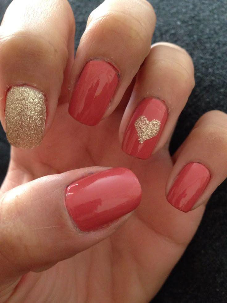 Peach-colored nails combined with gold glitter create a fresh and cheerful style. Subtle heart accents add a soft Valentine feel.