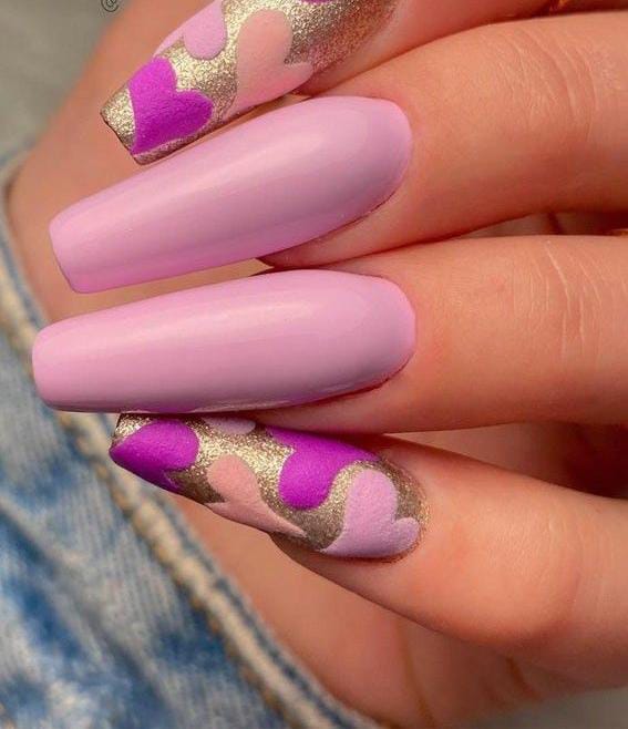 This design features a soft lilac base paired with purple heart on gold accents for a romantic, playful look. The mix of matte and shimmer gives it a modern Valentine vibe.