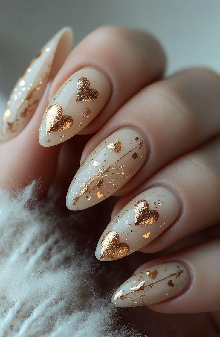 Warm nude and champagne shades are enhanced with fine gold heart outlines for a soft glam look. The design feels polished, romantic, and perfect for a refined Valentine aesthetic.