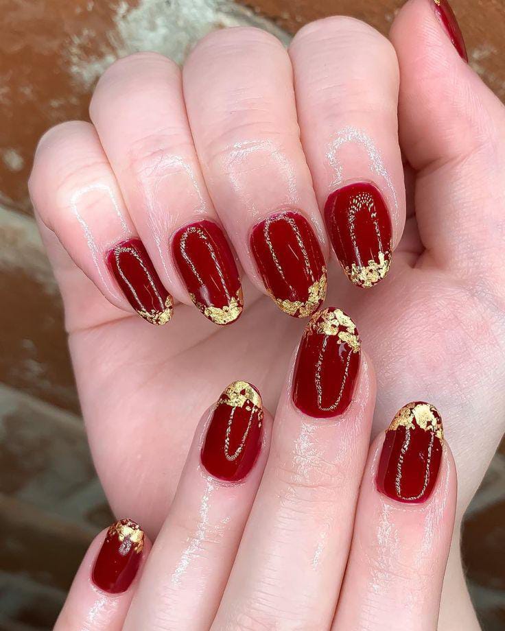 Deep red nails are finished with gold foil accents along the tips for a bold, classy style. It feels timeless, festive, and perfect for Valentine’s celebrations.
