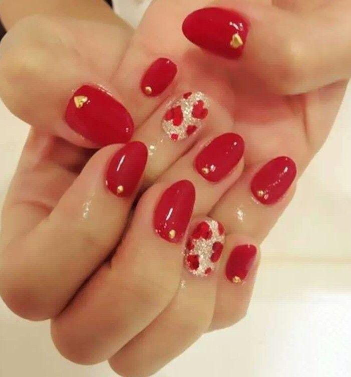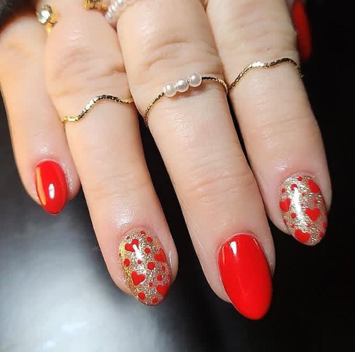 This design mixes bold red nails with gold glitter and tiny heart accents for a glamorous Valentine’s look. The overall vibe is festive, romantic, and eye-catching.