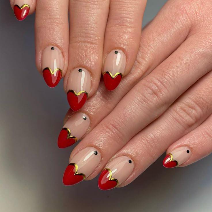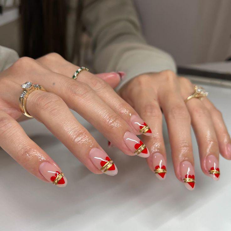 These nails feature nude bases with red heart-shaped tips outlined in gold. The look is playful yet polished, balancing romance with modern Valentine nail art.