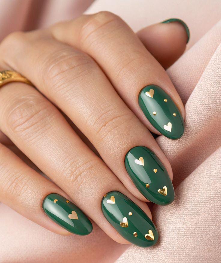 Deep green nails decorated with small gold hearts give a rich and luxurious Valentine feel. The design feels bold, romantic, and slightly dramatic.