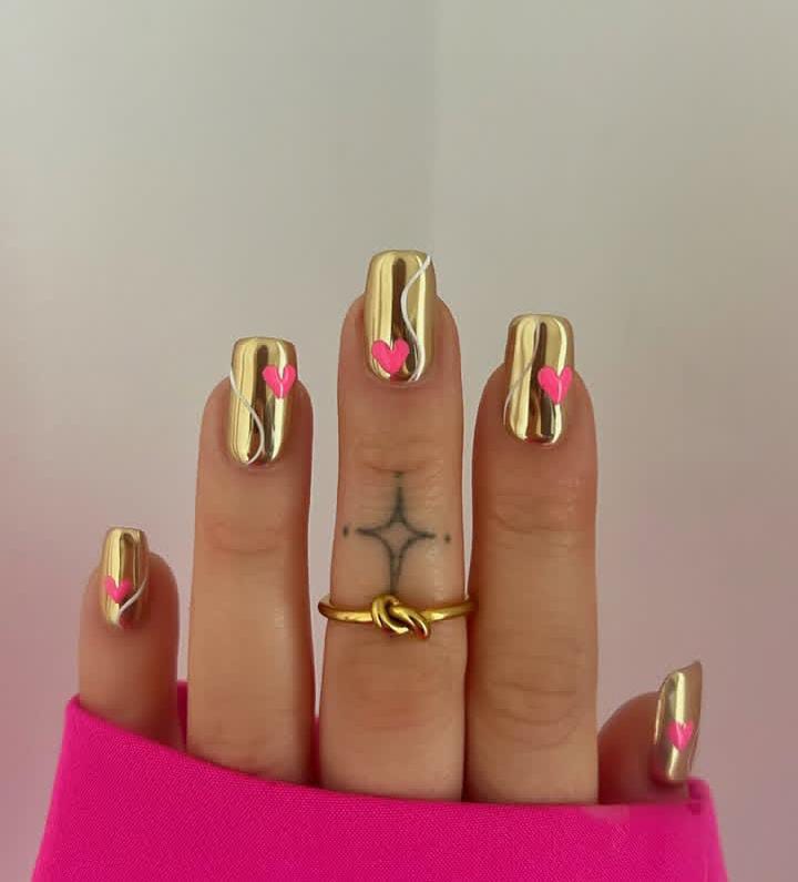 Shiny gold chrome nails with small pink heart accents create a modern and stylish Valentine design. The vibe is trendy, bold, and fashion-forward.