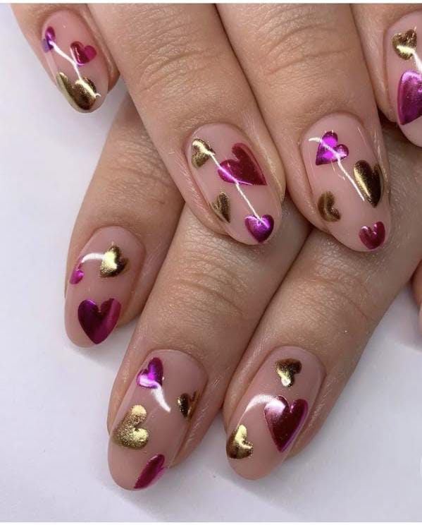 A soft nude base is decorated with shiny gold and rose heart accents for a sweet Valentine feel. The look is playful, glossy, and perfect for a romantic everyday style.
