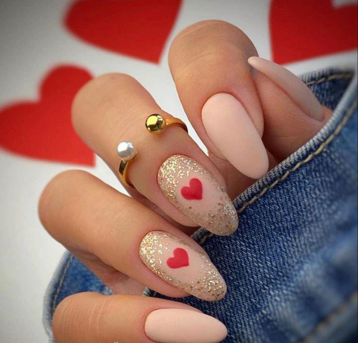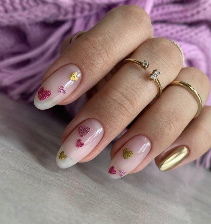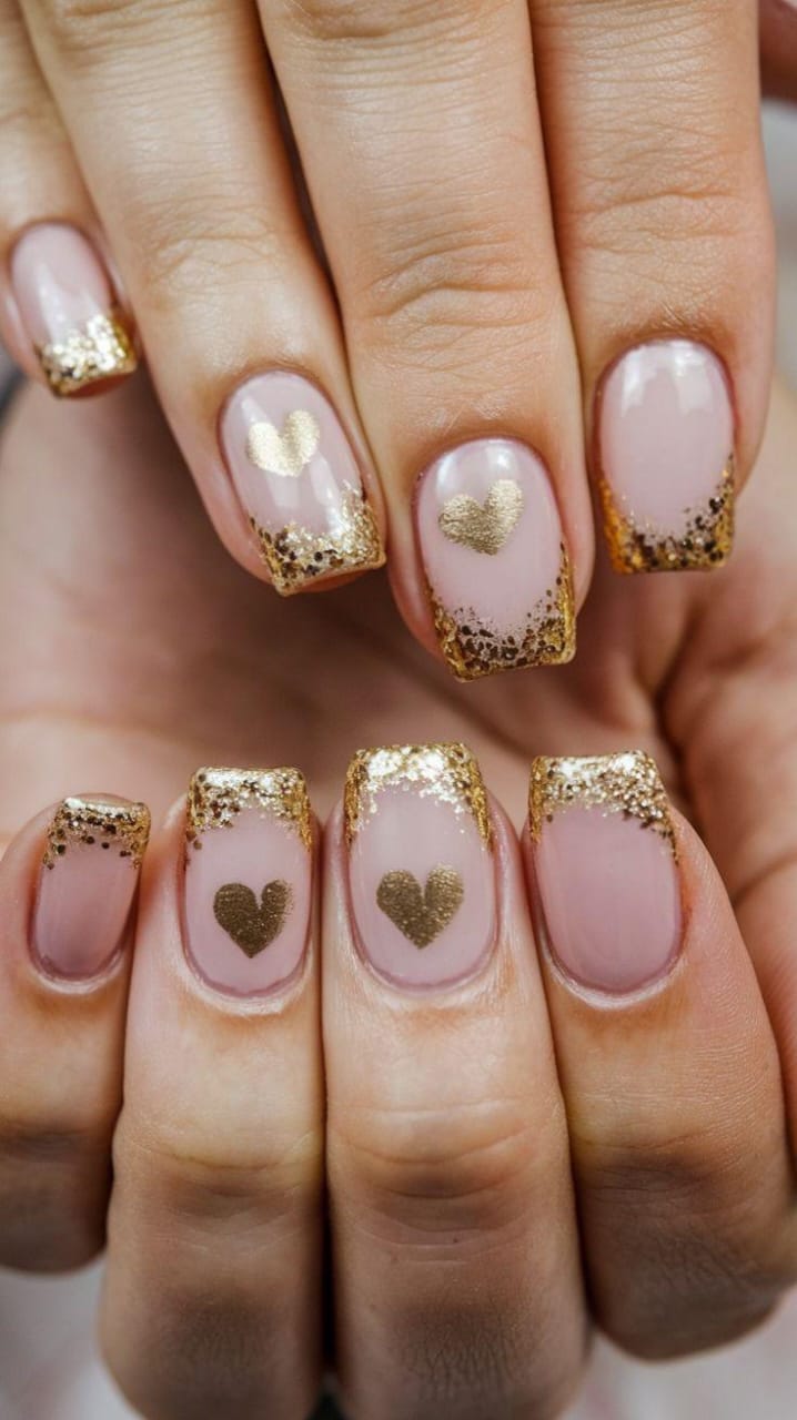 Classic pinkish peach nails are mixed with glittery gold accents and tiny heart details. The overall style is elegant, festive, and perfect for Valentine’s Day.