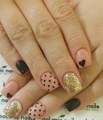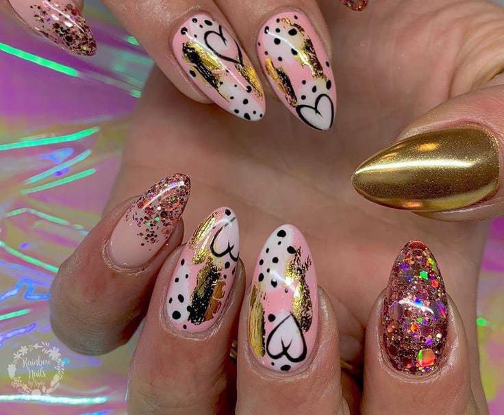 This design mixes bold gold chrome, glitter textures, and heart, dot details for a dramatic Valentine look. It feels artistic, glamorous, and perfect for special occasions.