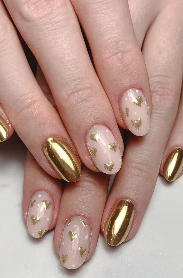 A pale nude and gold chrome base with scattered gold hearts creates a clean and minimal style. The vibe is classy, soft, and effortlessly romantic Valentines.