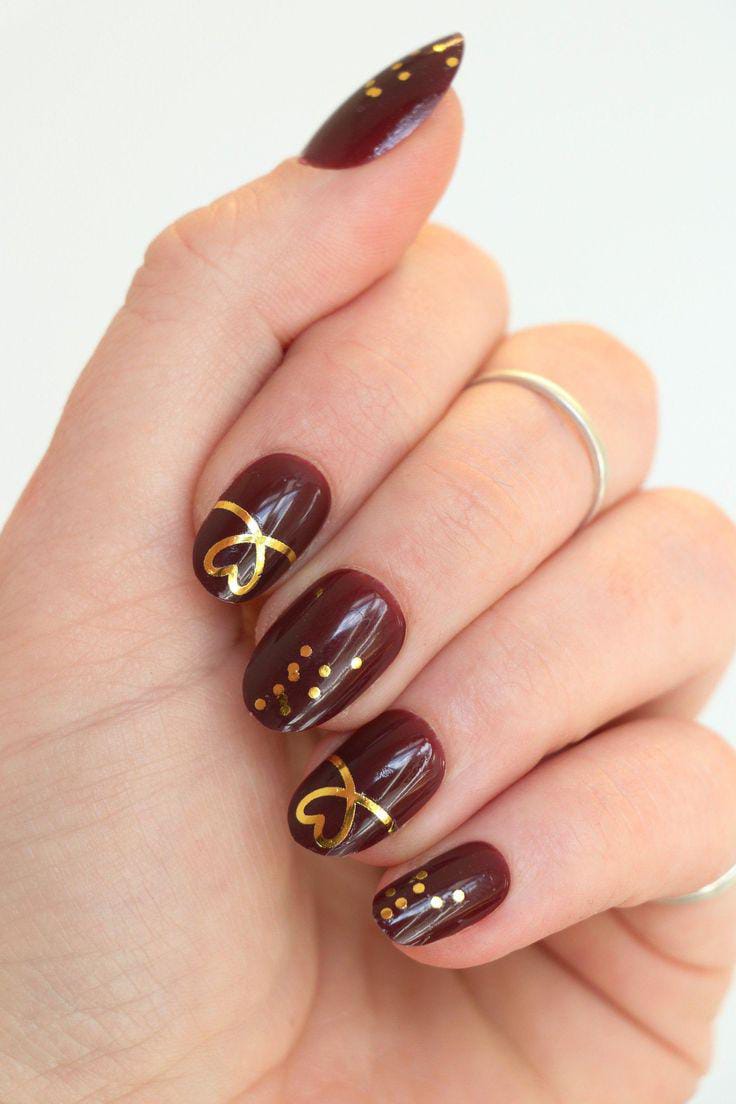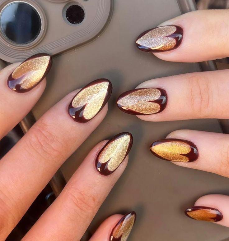 Deep brown nails with gold heart lines and dotted accents give a rich, luxurious feel. The design feels warm, modern, and bold with a Valentine twist.