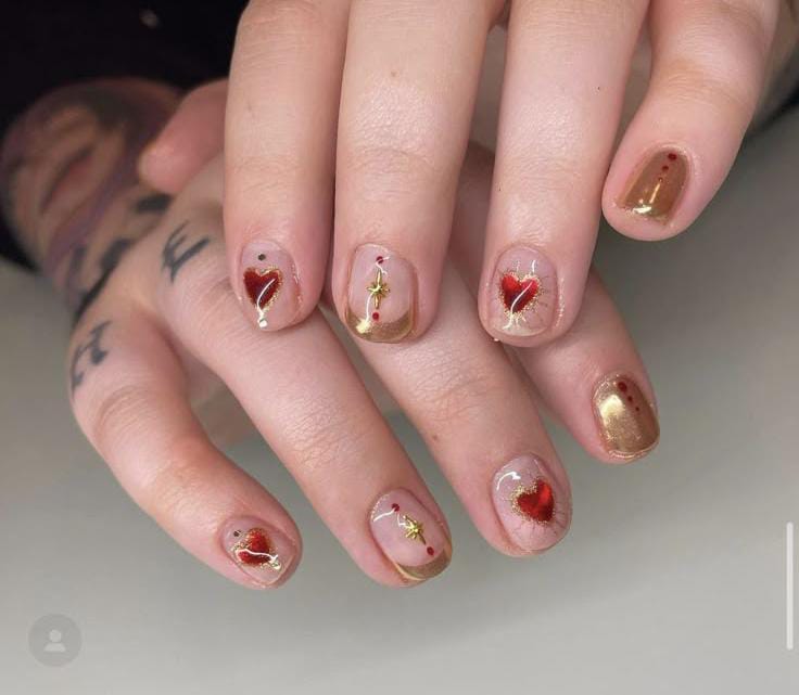 Classic sheer nude and gold nails are paired with tiny gold and pink hearts for a delicate finish. The design feels elegant, light, and subtly Valentine festive.