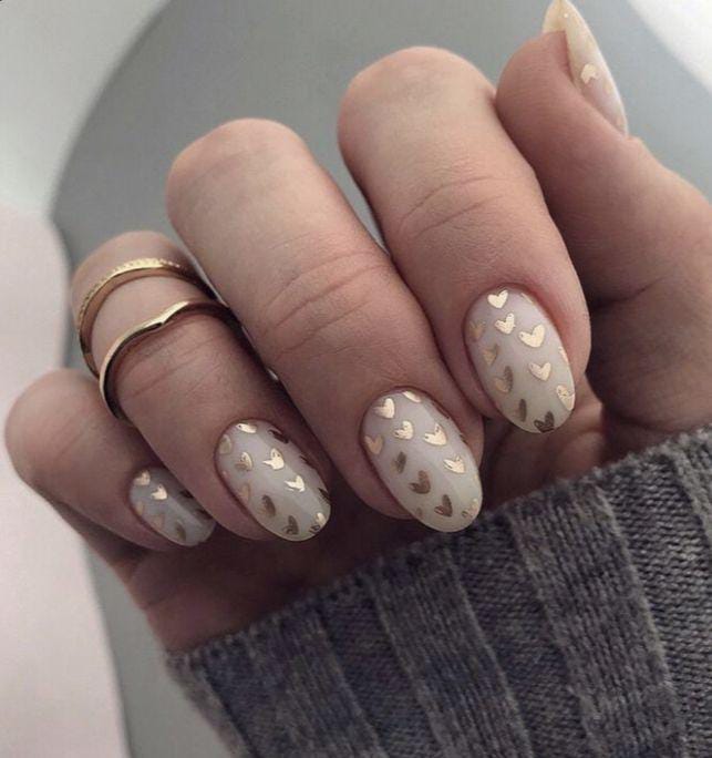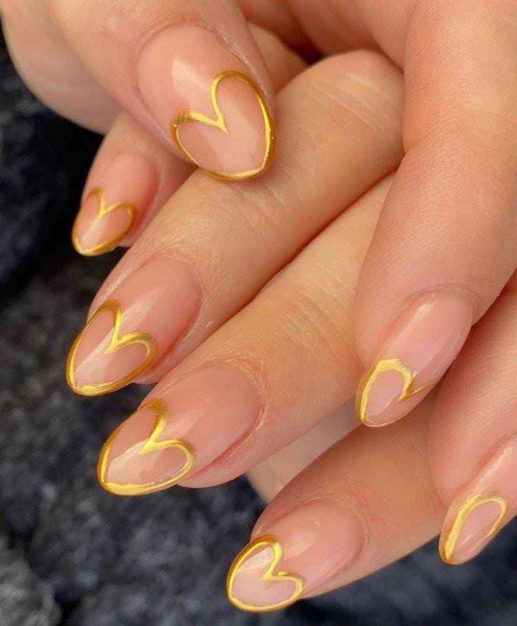 A soft nude base is paired with delicate gold heart outlines for a minimal yet romantic look. The design feels elegant, modern, and perfect for understated Valentine vibes.