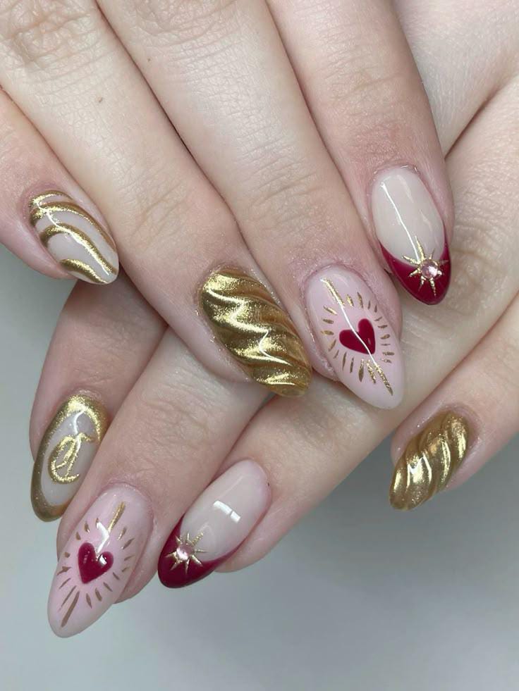 This set mixes nude tips and nails with rich gold chrome and deep red heart details. The overall vibe is bold, luxurious, and perfect for a glamorous Valentine look.