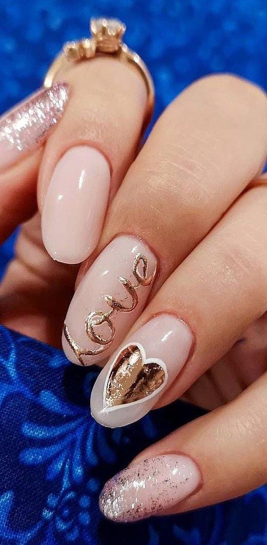 Milky nude nails feature gold foil hearts and elegant love-inspired lettering. The design feels modern, polished, and softly romantic Valentines.
