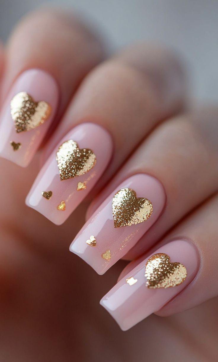 Blush pink nails are topped with shimmering gold heart accents that catch the light beautifully. The style is sweet, dreamy, and very Valentine-ready.