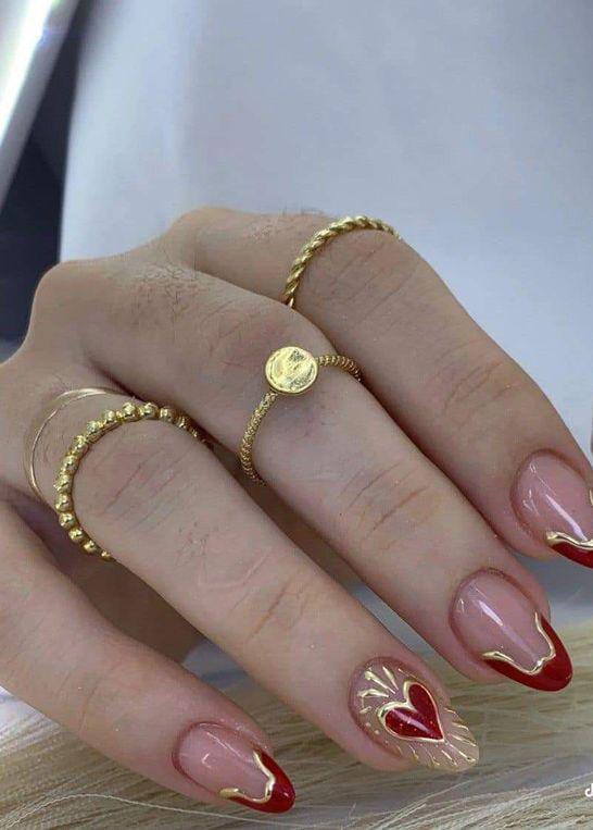 Nude french tip nails feature deep red heart details highlighted with fine gold lines. The mix of bold red and metallic gold creates a classy, statement-worthy Valentine style.