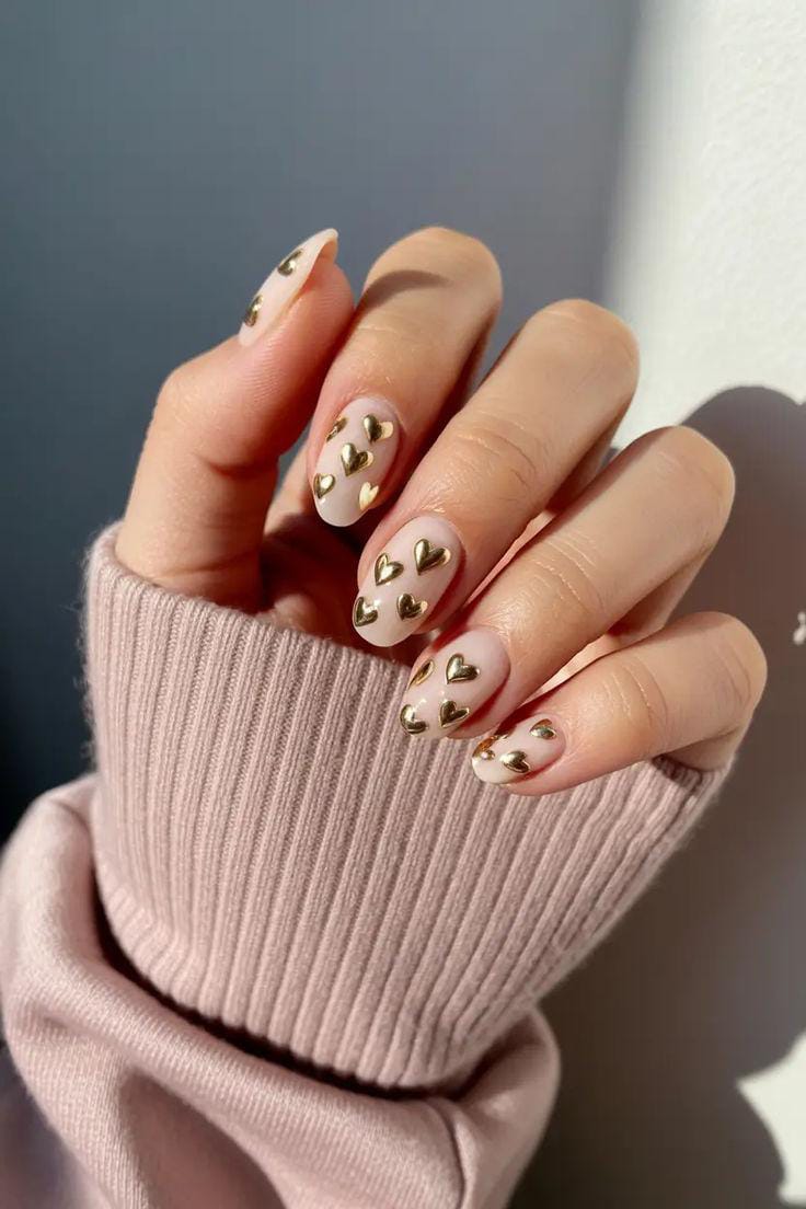 Soft nude nails are paired with tiny metallic gold heart accents for a clean and romantic look. The design feels simple, cozy, and perfect for understated Valentine’s vibes.