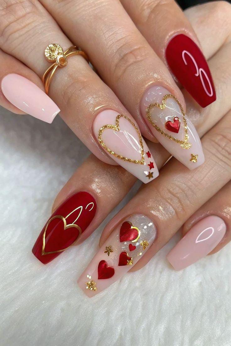 Classic red and blush nails are elevated with gold-outlined hearts accents. The look is glamorous, festive, and perfect for a statement Valentine manicure.