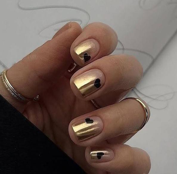 Muted nude nails feature a smooth gold chrome finish with tiny black heart accents. The overall vibe is minimalist, chic, and subtly romantic Valentine’s aesthetic.