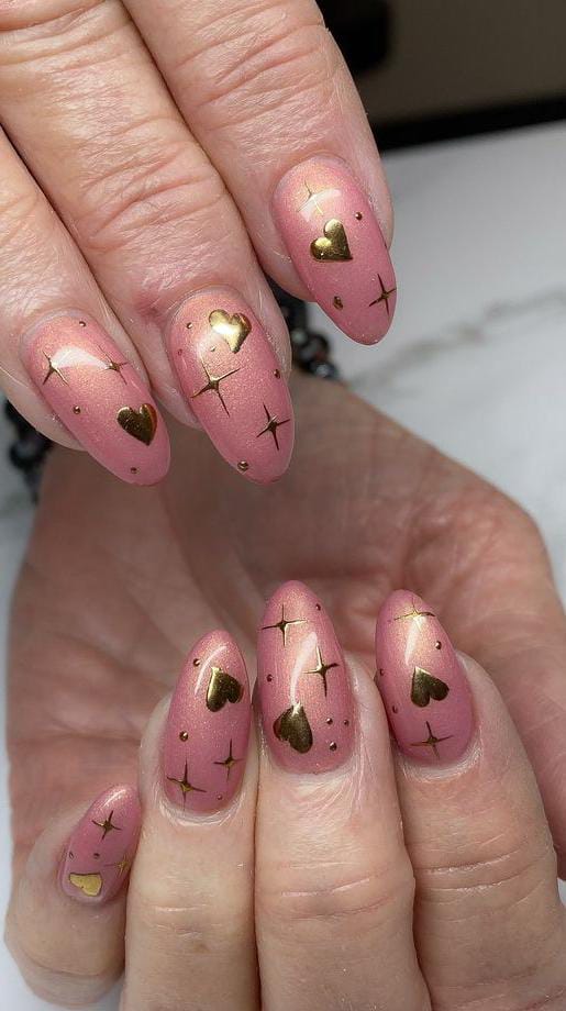 Soft blush-pink nails are decorated with tiny gold metallic hearts and delicate star accents, giving a sweet and dreamy Valentine vibe. The look feels romantic, light, and subtly sparkly.
