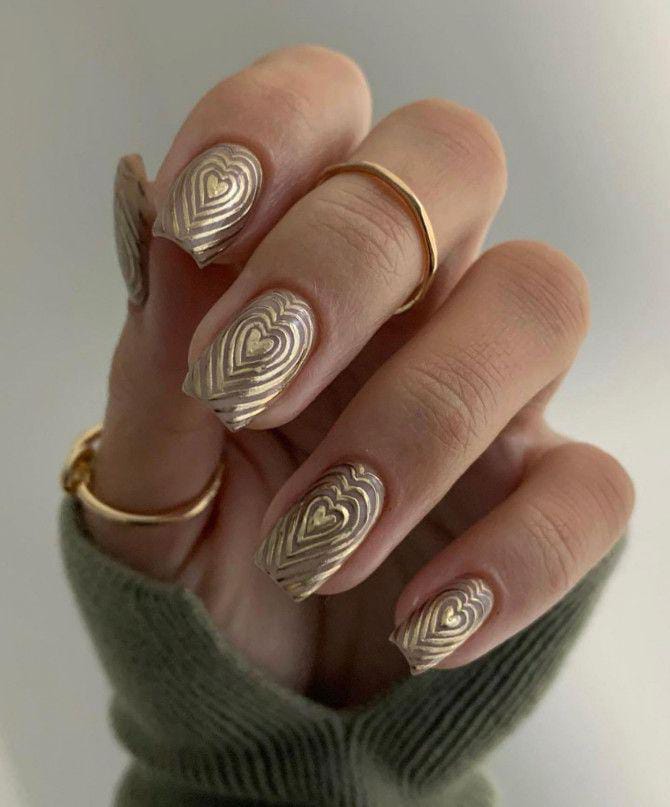 Neutral-toned nails feature layered gold heart patterns that create a modern, artistic Valentines effect. The overall vibe is chic, sophisticated, and slightly edgy.