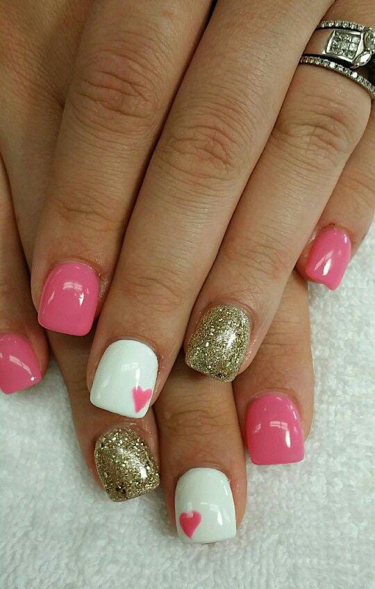 Soft pink and white nails are paired with gold glitter accents and tiny heart details. The look feels playful, romantic, and perfect for a cute Valentine vibe.