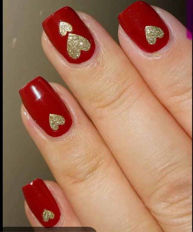 Deep red nails are decorated with small gold heart designs for a bold Valentine style. The overall look is elegant, glossy, and timeless.
