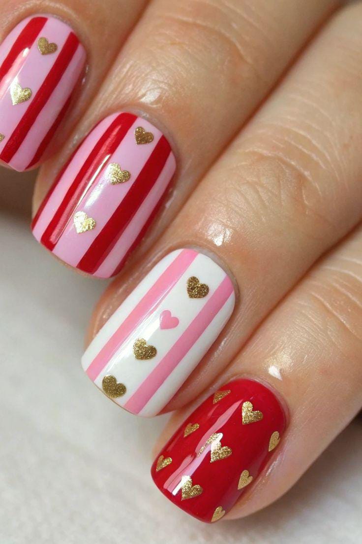 Red, pink, and white stripes are combined with scattered gold hearts across the nails. This design feels fun, festive, and full of Valentine energy.