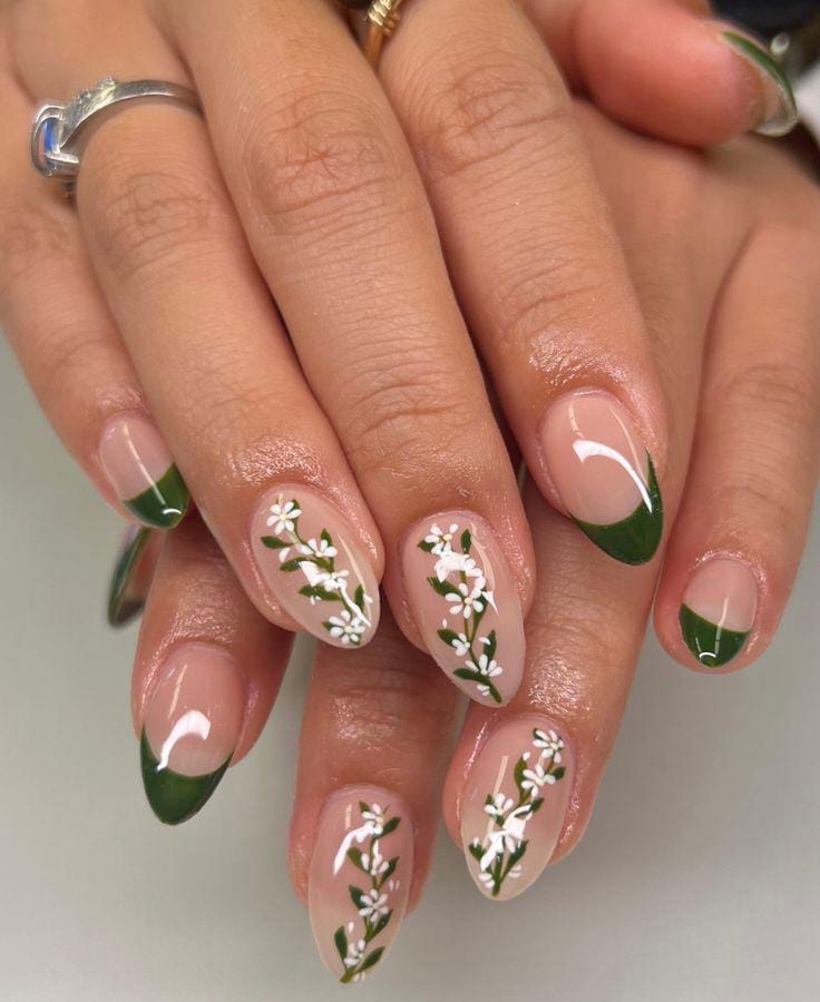 This design mixes deep emerald green nails with soft nude accents featuring delicate leafy and dot details. It feels fresh, earthy, and perfectly suited for an early March spring vibe.