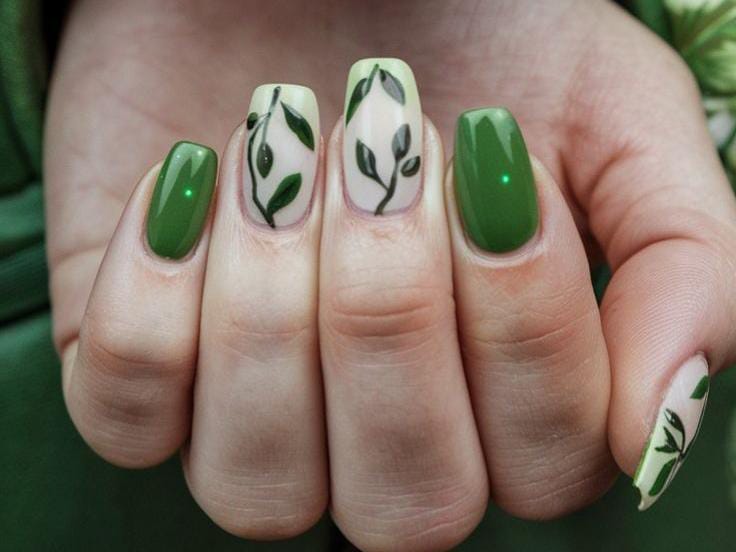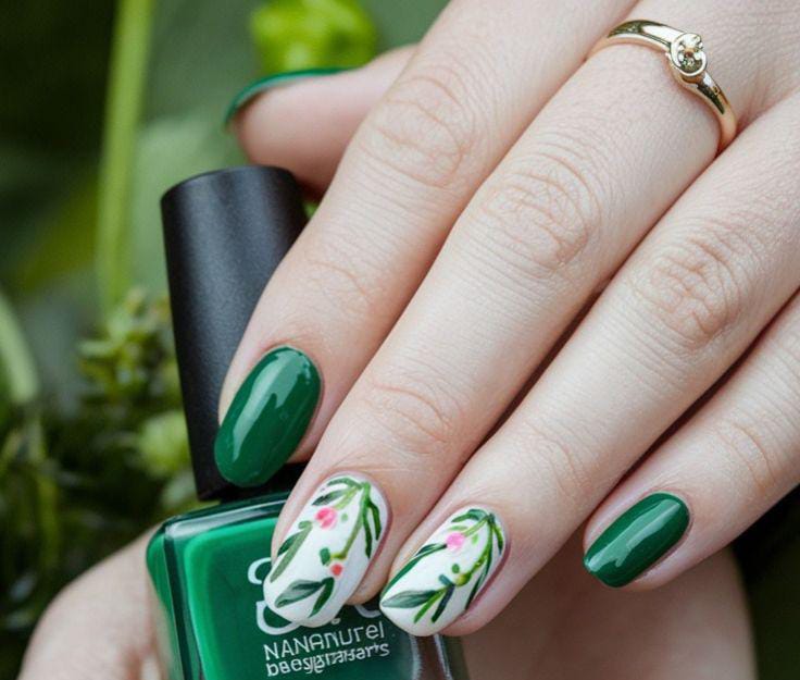 Deep green polish is combined with accent nails showcasing dark leafy patterns over a nude base. The style feels bold yet earthy, capturing a fresh March spring garden vibe.