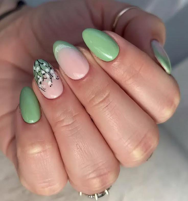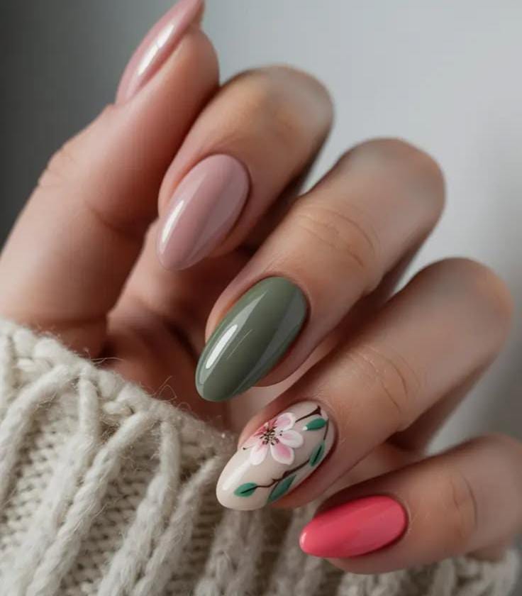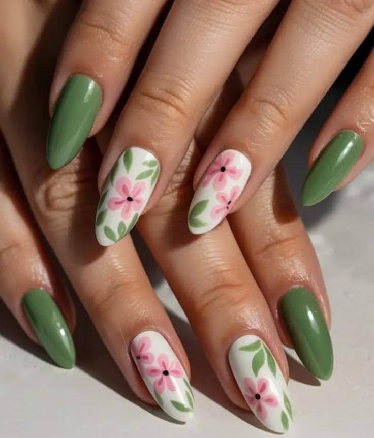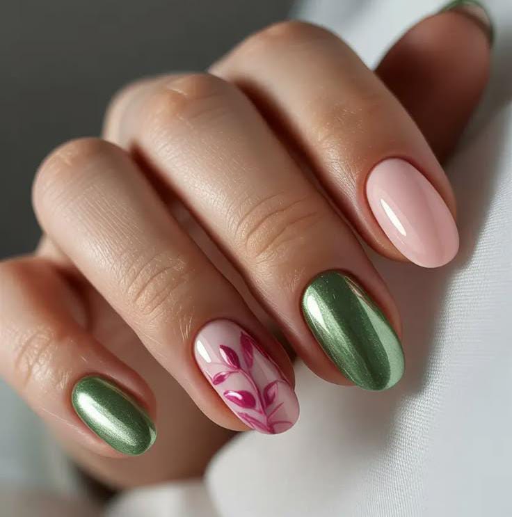 This design mixes soft blush pink and deep olive green with a delicate floral accent nude nail. It feels fresh and balanced with a calm, early March-spring vibe.