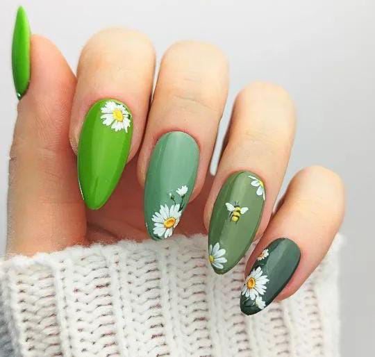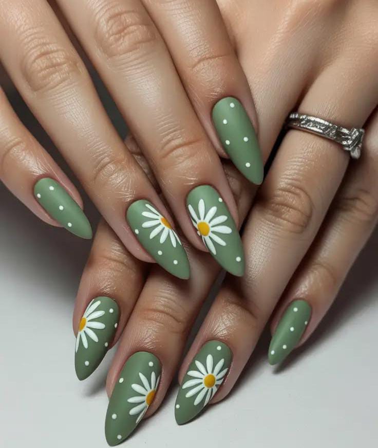 Soft sage green nails are decorated with white daisies and tiny polka dots for a playful spring touch. The look is sweet, fresh, and full of cheerful March charm.