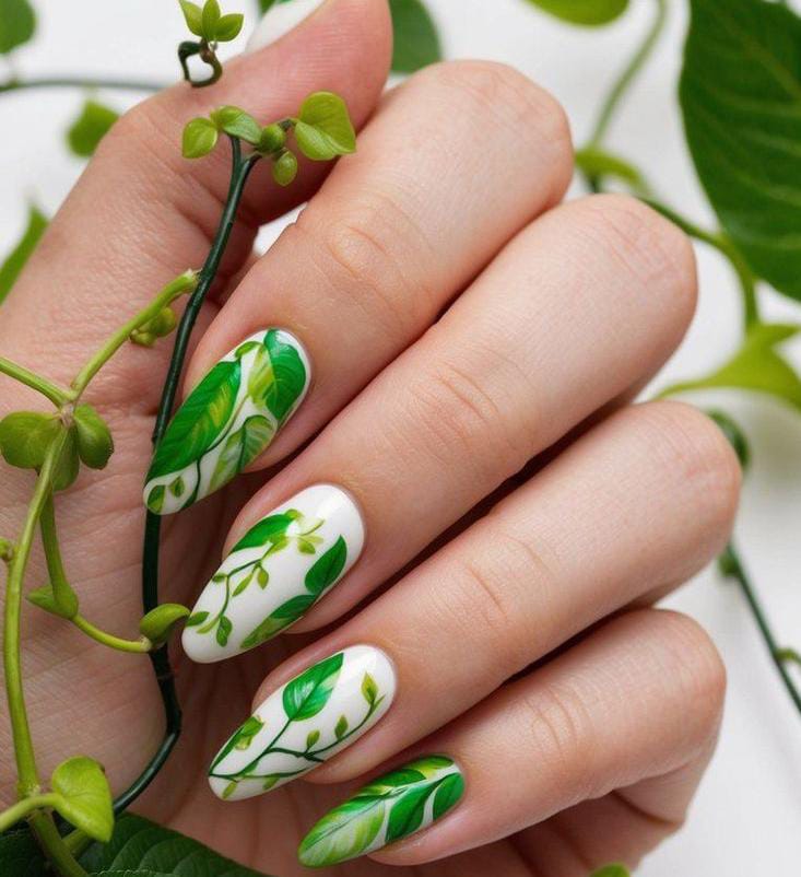White nails are detailed with vibrant green leafy vines that create a clean botanical design. It feels natural, airy, and inspired by March new spring growth.