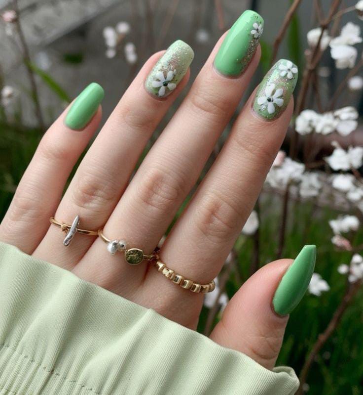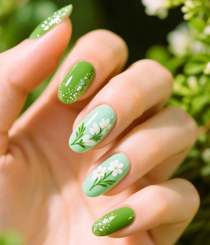 Glossy mint and bright green nails are paired with delicate white flowers and a touch of glittery sparkle. The design feels soft, fresh, and lightly radiant for early March spring energy.