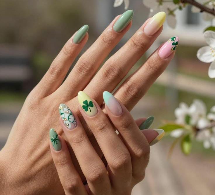 A sage green, yellow, and pink tip nail is accented with tiny clovers and floral details. The look is playful, airy, and full of cheerful March spring energy.