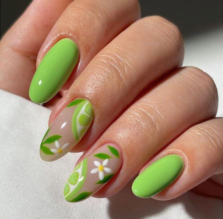This design pairs bright lime green nails with soft nude accents decorated in delicate white flowers, leaf and slice details. It feels fresh, cheerful, and perfect for welcoming March early spring.